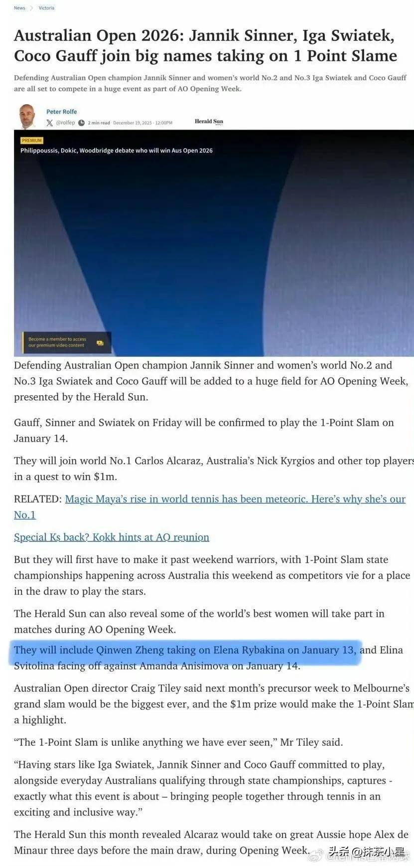 根据《先驱太阳报》的报道,澳网开幕周将安排大量表演赛。其中,1月13日即郑钦文对决莱巴金娜的“亚洲一姐”大战。1月14日,则由斯维托丽娜对战阿尼西莫娃。此外,高芙,辛纳,斯瓦泰克,阿尔卡拉斯将亮相全新推出的“1分大满贯赛”,冠军就有100万美元,堪称大手笔了!