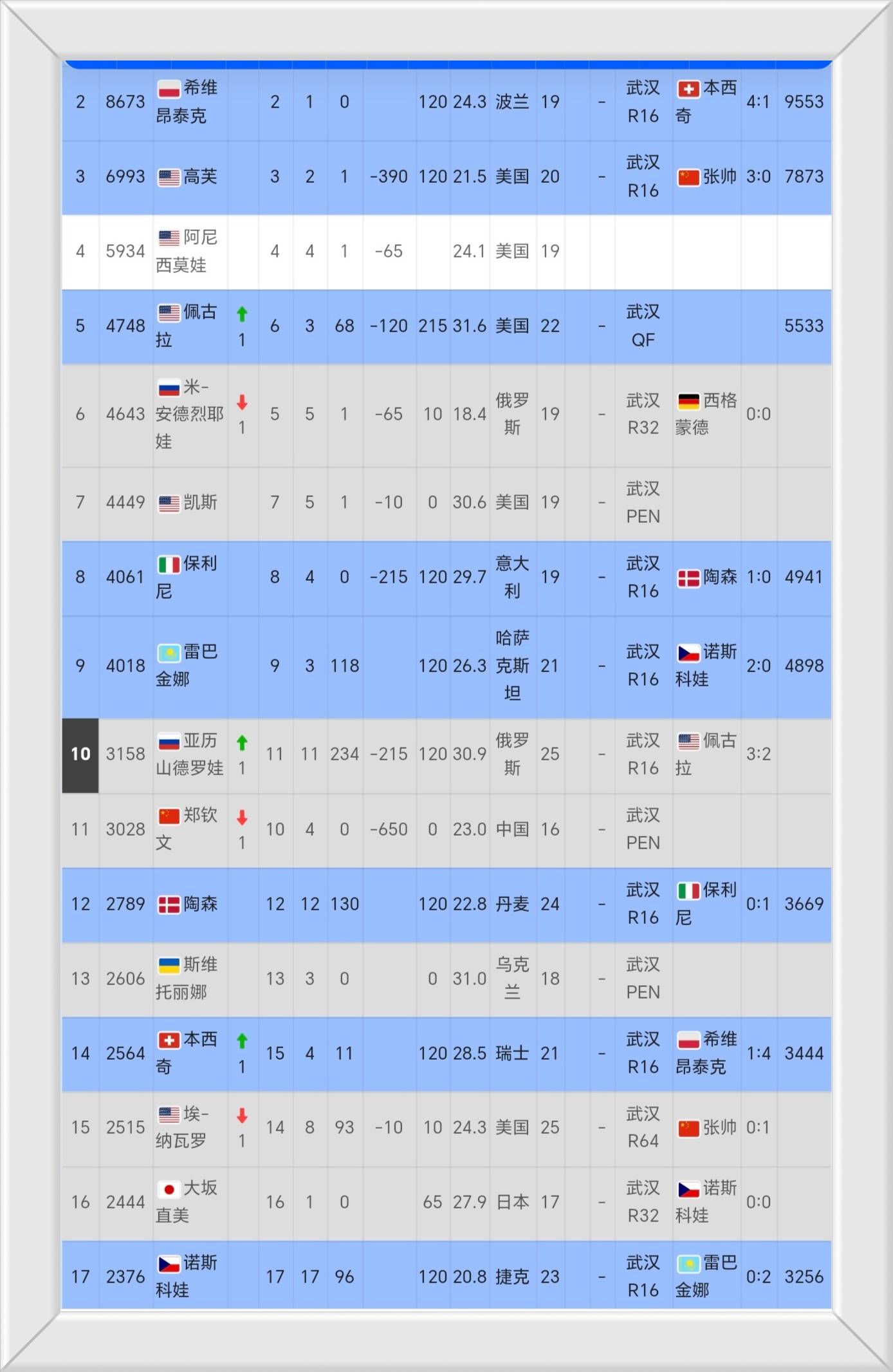 另一场焦点战,由赛会6号种子佩古拉对阵实力不俗的俄罗斯选手亚历山德罗娃。两人你来我往,互不相让,为观众奉献了一场扣人心弦的对决。首盘,佩古拉在关键时刻展现出更胜一筹的实力,以7-5先下一城。次盘,亚历山德罗娃凭借盘末的强势破发,以6-3扳回一局。决胜盘,佩古拉再次展现出“体能怪兽”的本色,以6-3锁定胜局,拒绝逆转。尽管失利,亚历山德罗娃的即时排名依旧成功跻身前十,将中国金花郑钦文挤至第11位。