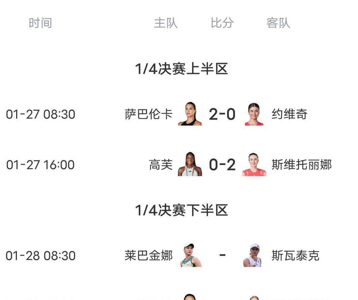 随着这两场比赛结束,本届澳网女单上半区的半决赛对阵已经确定:状态火热的萨巴伦卡将迎战创造历史的斯维托丽娜。 而今天,1月28日,下半区的两场四分之一决赛将决定最后两个四强名额的归属。
