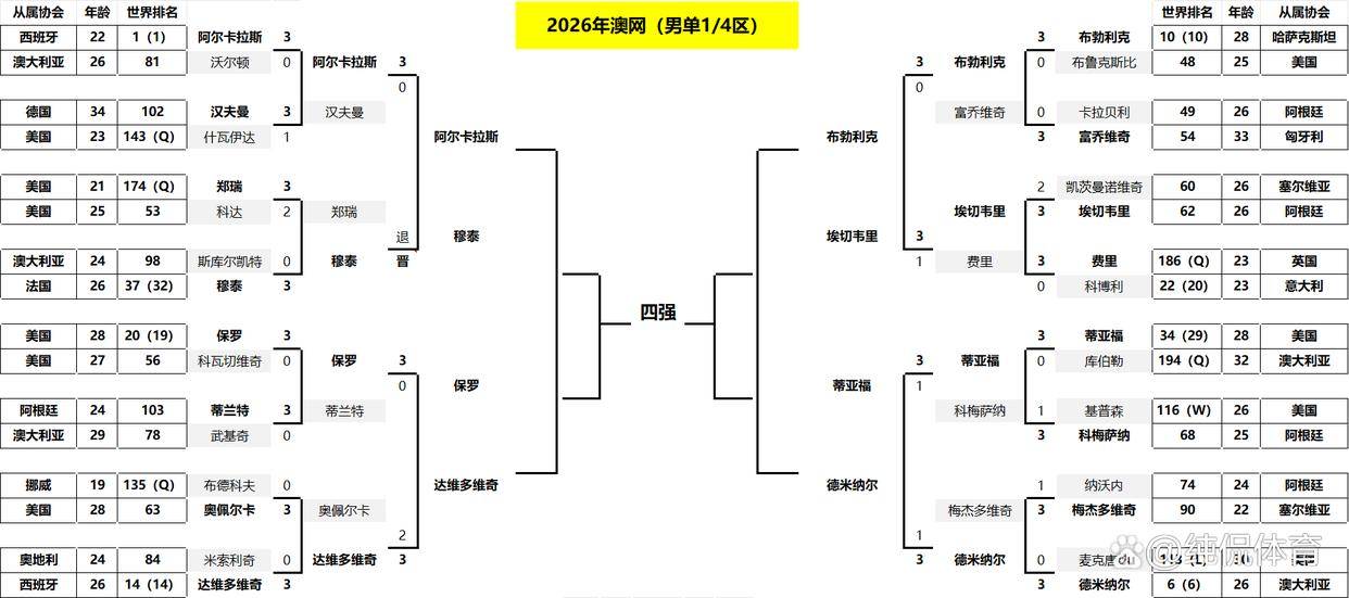 目前,男单八强已确定五席,分别是:头号种子、西班牙名将阿尔卡拉斯,他以未失一盘的强势姿态一路高歌猛进,展现出极佳的竞技状态,被视为本届澳网的夺冠热门。如果阿尔卡拉斯最终能够捧起冠军奖杯,他将成为公开赛年代以来最年轻的全满贯得主,创造新的历史。此外,3号种子、德国名将兹维列夫,4号种子、塞尔维亚天王德约科维奇,6号种子、东道主澳大利亚名将德米纳尔,以及25号种子、美国选手勒纳-钱也成功晋级八强。
