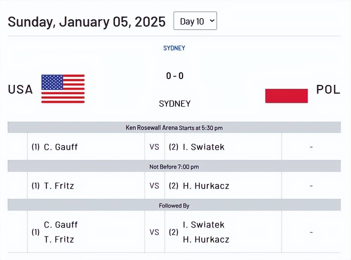 波兰队与美国队的联合杯决赛具体对阵已经出炉:高芙vs斯瓦泰克,弗里茨vs胡尔卡奇,高芙/弗里茨vs斯瓦泰克/胡尔卡奇。返回搜狐,查看更多