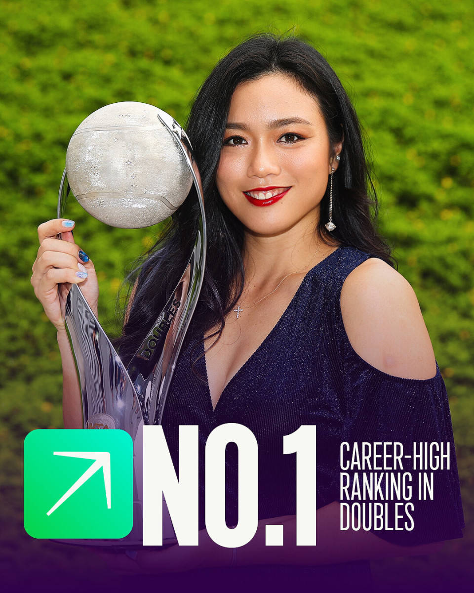 詹咏然的职业生涯共59次闯入巡回赛双打决赛,拿下了其中33座冠军头衔。在这33座冠军头衔当中,包括了9次WTA1000级别赛事冠军,此外还有她最重要的一座冠军奖杯——2017年搭档辛吉斯赢得美网女双冠军。也正是在那一年赛季末,詹咏然曾登上双打世界第一的宝座。