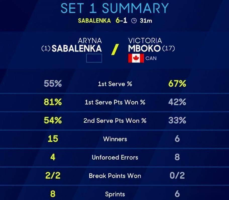 第七局是萨巴伦卡的发球胜盘局。 她没有给对手任何机会,再次以“love game”的方式干净利落地拿下。 6-1,萨巴伦卡只用时27分钟就赢下了第一盘。 这一盘的技术统计对比鲜明:萨巴伦卡轰出了15记制胜分,而姆博科只有6个;非受迫性失误方面,萨巴伦卡控制得更好,仅有4次,姆博科则有8次。