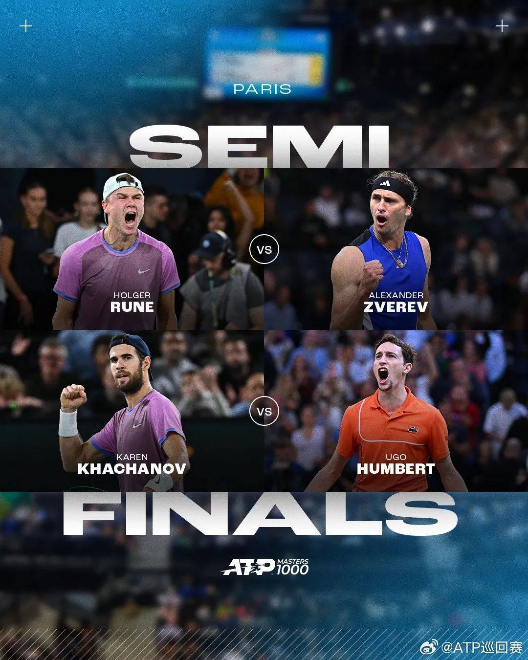 1/4决赛中,德国好手兹维列夫7-5/6-4击败西西帕斯,将双方交手记录改写为6-10,这是他第20次打进大师赛四强。前赛会冠军“腿哥”鲁内以6-4/4-6/7-5战胜德米纳尔。