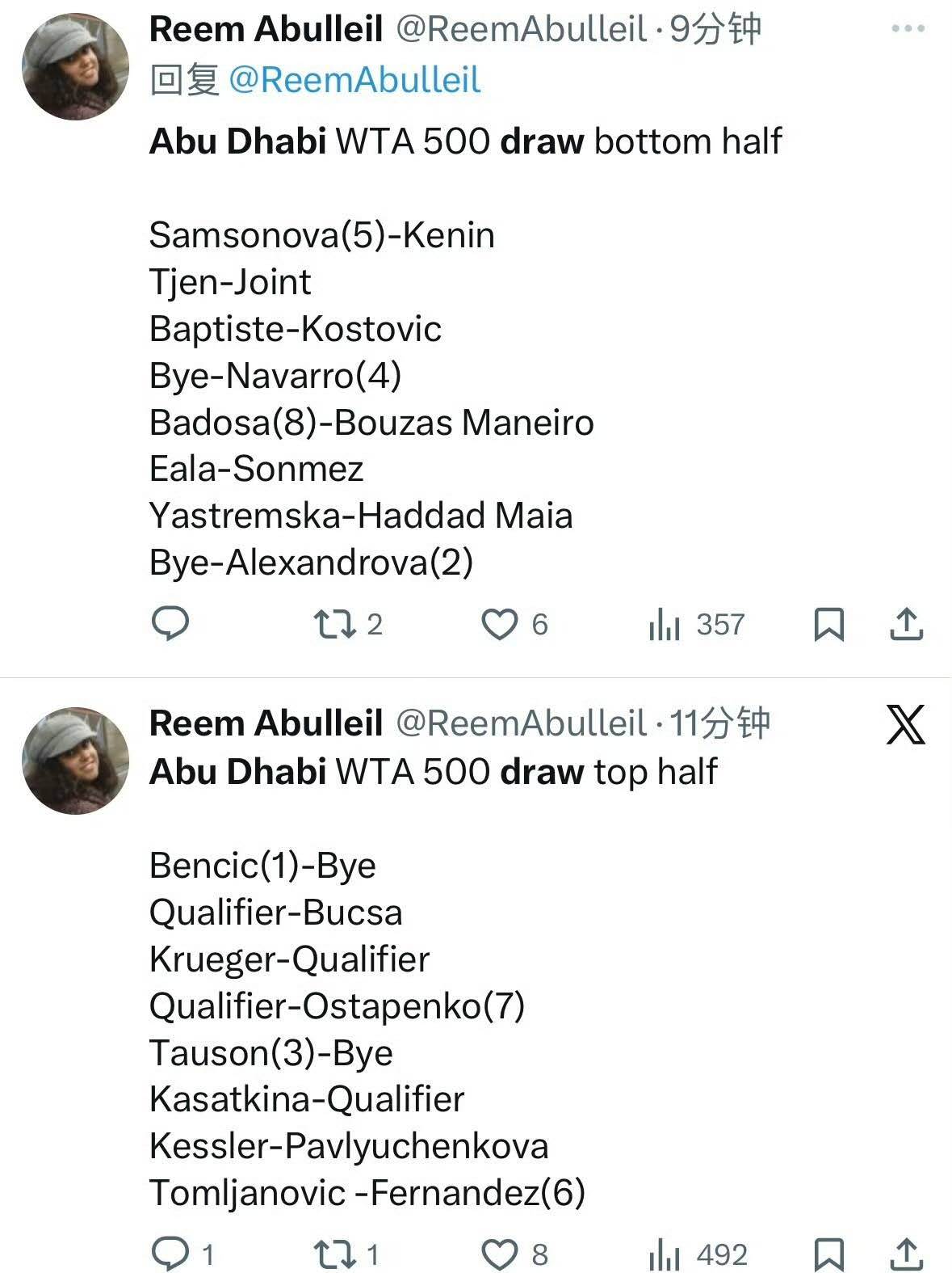 退赛消息传出后,WTA阿布扎比站的签表进行了调整。随着郑钦文的退出,以及新科澳网冠军莱巴金娜因需休整同样退出本站赛事,卫冕冠军本西奇成为赛事的头号种子。