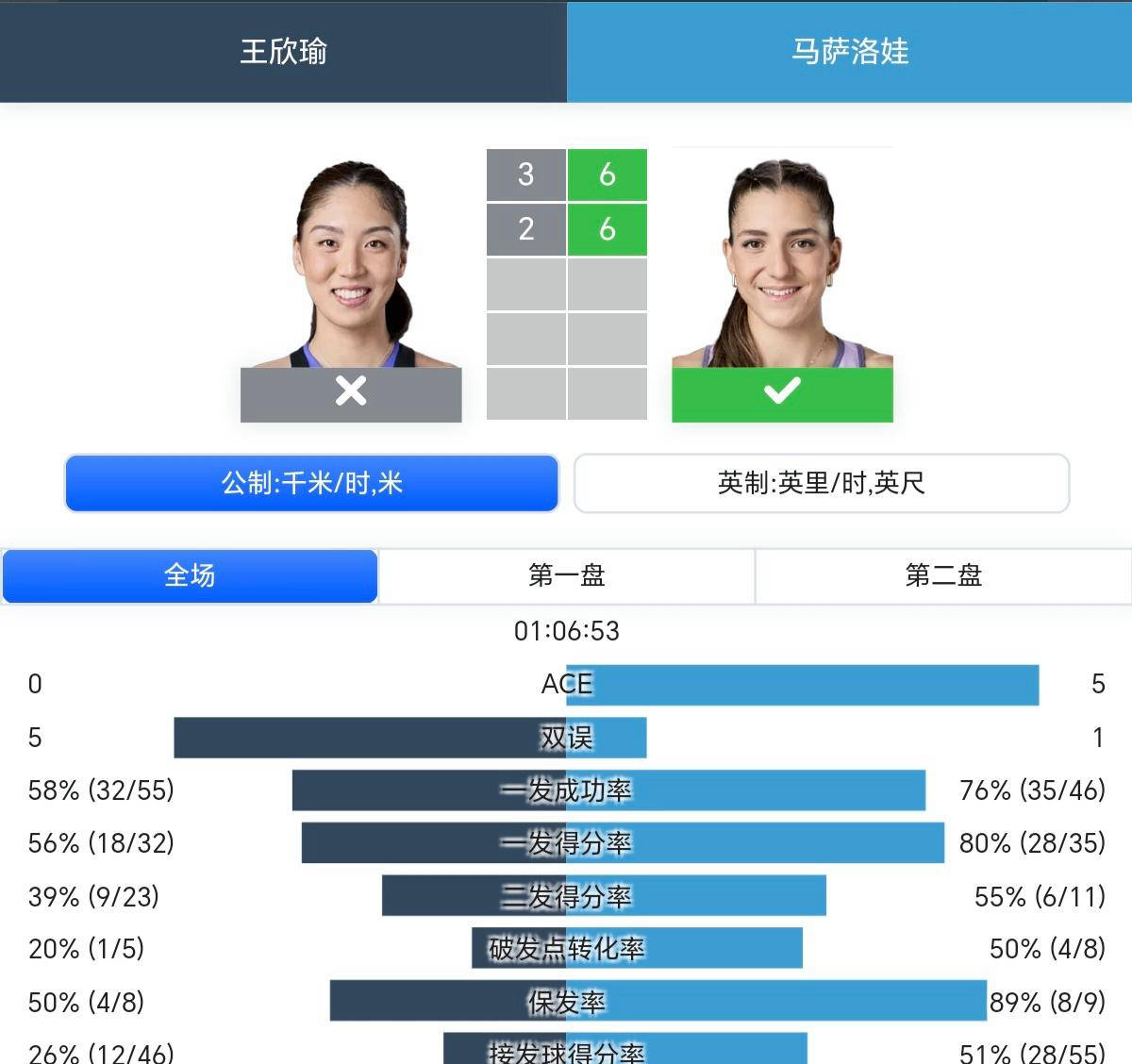 比赛细节显示,王欣瑜在发球阶段表现欠佳,全场无ACE,送出5个双误,而对方打出5ACE,仅有1次双误侵扰。发球一发得分率58%,二发得分率仅39%,远低于马萨洛娃的80%和55%。在关键破发机会中,王欣瑜虽然创造了5次破发点,但只成功转化1次;反观马萨洛娃8次获得机会,成功实现4次破发,占据主动。赛场上的数据反映了王欣瑜底线对抗中的频繁失误,也揭示了她状态波动较大。结果,马年伊始,作为夺冠热门和头号种子的王欣瑜遗憾首轮出局,开局并不顺利。